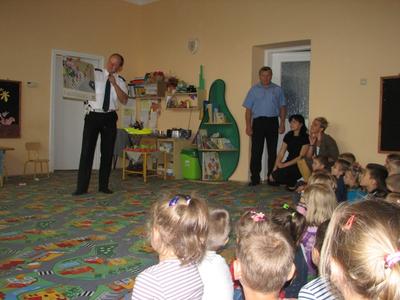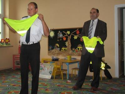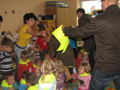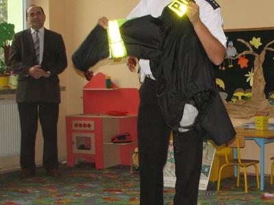 Troszcząc się o bezpieczeństwo dzieci na drodze, w naszej szkole odbyło się 2 października 2012 roku spotkanie z Policjantem pod hasłem: WIDOCZNY PRZEDSZKOLAK. Przedszkolaki z uwagą wysłuchały zasad poprawnego poruszania się po jezdni, z zaciekawieniem oglądały kolorowe plansze rysunkowe, zadawały wiele pytań oraz podawały trafne przykłady ukazujące bezbieczne czy też niebezpieczne zachowania dzieci w ruchu pieszych. Na koniec spotkania dzieciom zostały wręczone chusty z odblaskami, które mają sprawić, aby były bardziej widoczne na drodze. Chusty te sponsorowane były przez Urząd Gminy Tomice. Dzieci będą wykorzystywać je z radością przy każdej sytuacji, w której będą wychodzić na spacery.