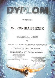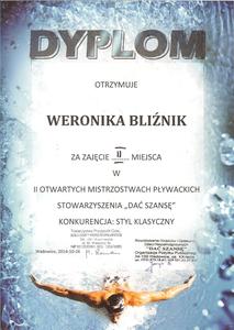 *II Otwarte Mistrzostwa Pływackie Stowarzyszenia "Dać Szansę" Wadowice 26 X 2014 r.: Weronika Bliźnik - I miejsce w stylu grzbietowym, II miejsce w stylu klasycznym, I miejsce w stylu dowolnym (kraul)