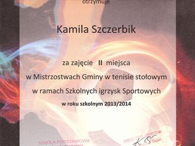 *II miejsce w Mistrzostwach Gminy w tenisie stołowym dla Kamilii Szczerbik - 2013/2014