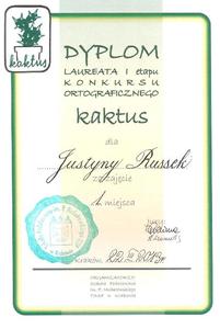 *tytuł laureata konkursu ortograficznego Kaktus dla Justyny Russek /kl. III/ - Kraków 2013 r.