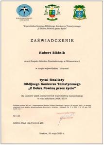 *Tytuł Finalisty Kuratoryjnego Biblijnego Konkursu Tematycznego "Z Dobrą Nowiną przez życie" - Hubert Bliźnik - Kraków, 20.05.2019 r.
