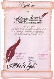 *Tytuł Mistrza Ortografii Gminy Tomice wśród kl. IV - VI dla Justyny Russek - maj 2016 r.