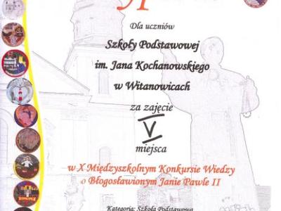 *V miejsce w finale powiatowego X Międzyszkolnego Konkursu Wiedzy o Błogosławionym Janie Pawle II - 7.04.2014 r.