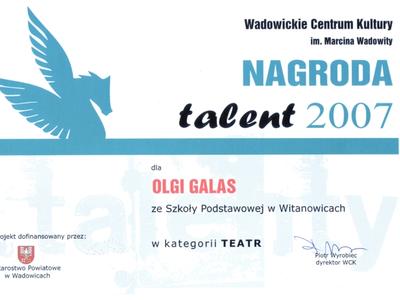*talent 2007 w kategorii Teatr dla Olgi Galas