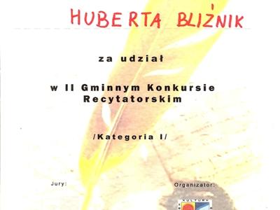 *wyróżnienie w II Gminnym Konkursie Recytatorskim dla Huberta Bliźnik w grupie przedszkolaków - Tomice 2012