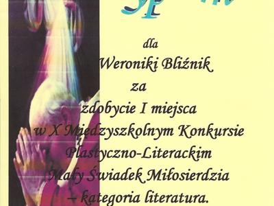 *I miejsce w X Międzyszkonym Konkursie Plastyczno - Literackim "Mały świadek Miłosierdzia" dla Weroniki Bliźnik w kategorii literackiej - Babica 2011
