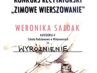 * III miejsce Natalia Janicka w Gminnym Konkursie Recytatorskim "Zimowe wierszowanie" dla kl. IV - VI - styczeń 2015