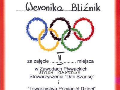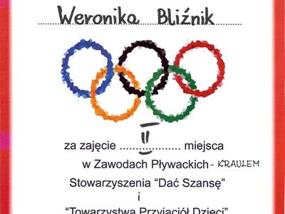 * II miejsce w Zawodach Pływackich Stowarzyszenia "Dać Szansę" i "Towarzystwa Przyjaciół Dzieci" /stylem kraul i klasycznym/ dla Weroniki Bliźnik - Wadowice, 13.10.2013 r.