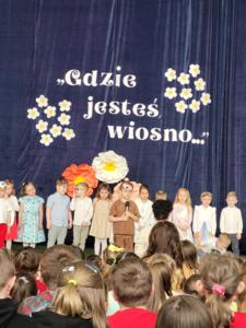 ,, Gdzie jesteś Wiosno...'' Z okazji Powitania Wiosny 5 latki przygotowały przedstawienie, w którym to na początku Pani Zima chełpiła się swoją władzą nad światem. Pozostałe dzieci prosiły ją by berło przekazała wiośnie wołały ją śpiewając piosenki. Gdy się pojawiła, w zamian wręczyła każdej dziewczynce kwiatuszek a chłopcom koniczynkę. Dzieci wykazały się dużym zaangażowaniem i talentem nie tylko aktorskim ale i muzycznym.