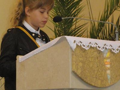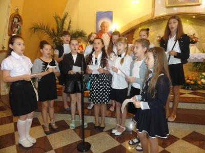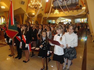 W piątek 27 czerwca 2014 roku o godz. 8.30 w parafialnym kościele uczestniczyliśmy w dziękczynnej Mszy Św. za miniony rok szkolny, po której udaliśmy się do budynku szkoły. Tutaj w odświętnych strojach z radością czekaliśmy na oficjalne wręczenie nam wyników całorocznej pracy - świadectw i oczywiście nagród. W części oficjalnej Pan Dyrektor podziękował wszystkim za całokształt pracy, a szczególnie tym, którzy przeżywali jubileusze. Byli to: pani Anna Bussler - 35 lat pracy, pani Barbara Zając - 30 lat pracy, pan Krzysztof Galas - 20 lat pracy.