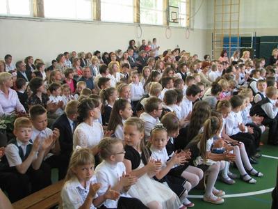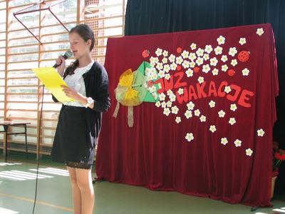 W dalszej części nastąpiło wręczenie świadectw z wyróżnieniem i nagród książkowych, które ufundowała Rada Rodziców. Nie zabrakło miłych słów wypowiedzianych przez pana Piotra Jureckiego - przewodniczącego Rady Rodziców- oraz Ks. proboszcza Józefa Wróbla. Ksiądz, dziękując Gronu Pedagogicznemu za współpracę, szczególną wdzięczność skierował wobec Pana Dyrektora. Ważnym momentem było przekazanie Sztandaru nowemu Pocztowi, w skład którego wchodzą: Antoni Kokoszka, Gabriela Ciernia, Natalia Leśniak. Podniosłym momentem było złożenie przez uczniów klasy VI uroczystego ślubowania. Na zakończenie wspólnego spotkania na Sali gimnastycznej, najmłodsi z naszego grona, a więc 3 i 4-latki przedstawili piękną część artystyczną. I wreszcie spotkania w klasach z Wychowawcami oraz kolegami i koleżankami. Tutaj nasi nauczyciele przypomnieli nam jeszcze raz o zasadach bezpiecznego wypoczynku, życząc niezapomnianych wrażeń, wspaniałych spotkań z ludźmi i…