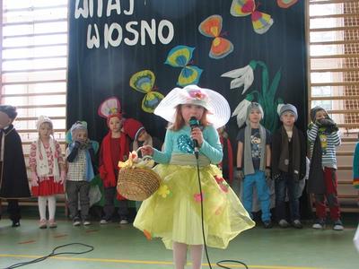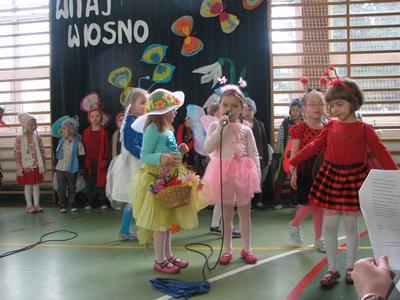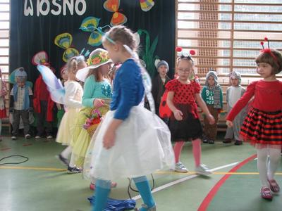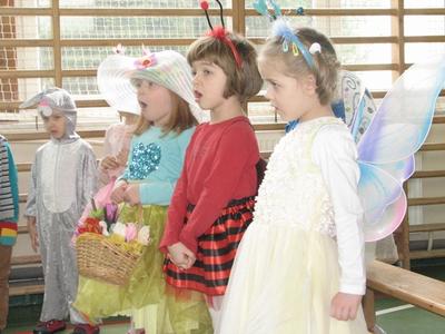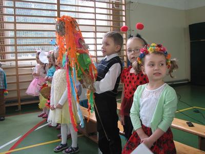 Dnia 26.03.2015r. Nasze Przedszkolaki (oddział 4-5latki) przygotowały uroczysty apel na powitanie Wiosny. Występowały: dzieci zmęczone już zimą, ptak Feluś, zając Maciuś, żabka Kum- kum, Motyle, Biedronki, a nawet Marzanna. Jednak najważniejsza była pani Wiosna.