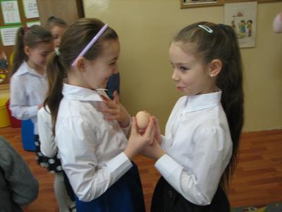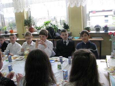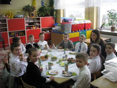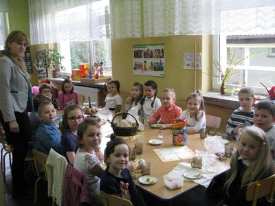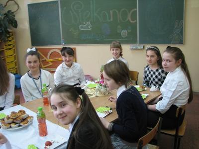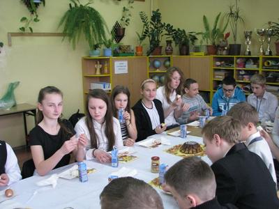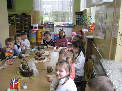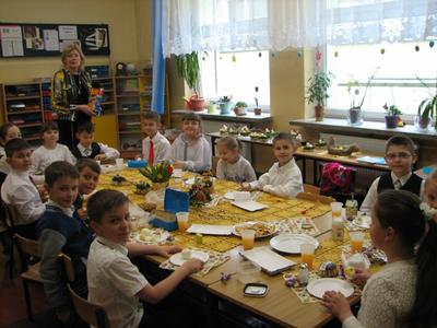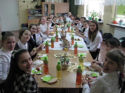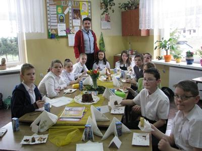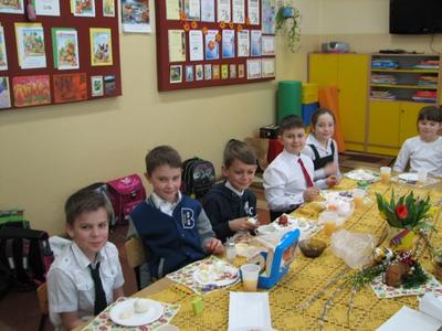 W naszej szkole, nie tylko przed Świętami Bożego Narodzenia zasiadamy przy świątecznym stole, ale również przed Wielkanocą. Pięknie nakryty stół, na nim stroiki wielkanocne, słodkie baby i oczywiście smaczne jajka. Nie mogło zabraknąć serdecznych życzeń, stukania się jajkami oraz opowiadań o tradycjach rodzinnych, które przeżywamy w domach. Wspaniała atmosfera. Już teraz można było poczuć klimat tych największych świąt chrześcijańskich - Świąt Paschalnych.