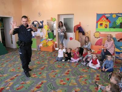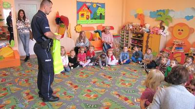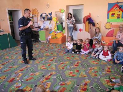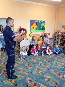 W dniu 28.09. na zaproszenie dzieci i nauczycieli przybył do Maluszków i Średniaków policjant z Komendy Powiatowej Policji w Wadowicach. Podczas spotkania przedszkolaki dowiedziały się jak ważna, odpowiedzialna i niebezpieczna jest praca policjanta, a także jak wygląda umundurowanie. Nasz gość wyjaśniał jak należy poruszać się po drogach, aby bezpiecznie dotrzeć do celu. Żaden z przedszkolaków nie miał również problemu z określeniem jak należy prawidłowo korzystać z sygnalizacji świetlnej. Wszyscy wiedzieli, że powinni przechodzić przez ulicę pod opieką osoby dorosłej. Spotkanie Pana policjanta z naszymi wychowankami przebiegało w bardzo miłej i serdecznej atmosferze. Od dzisiaj każdy przedszkolak już wie, ze policjant może być przyjacielem, który zawsze chętnie służy pomocą