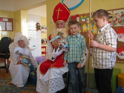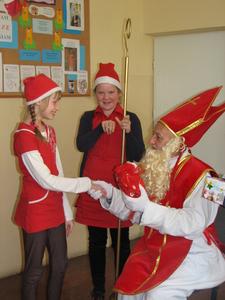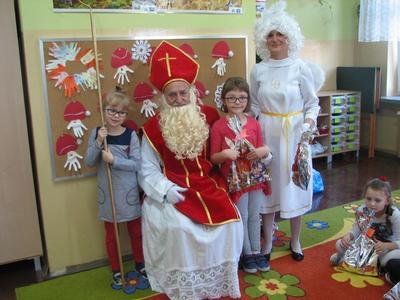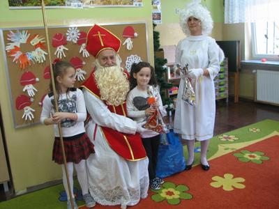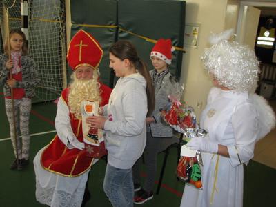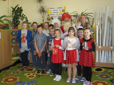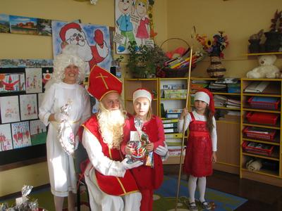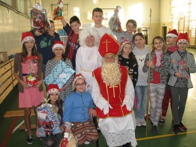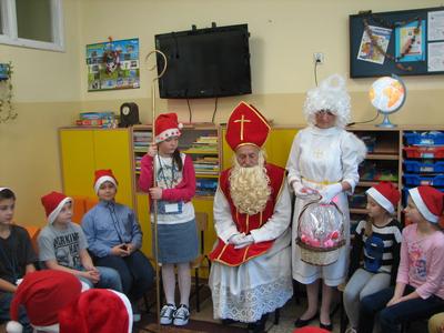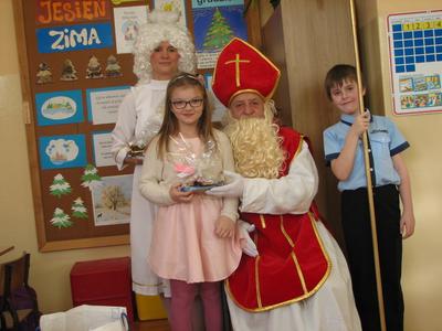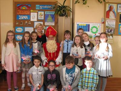 Tak właśnie wspominały dzieci pierwsze chwile spotkania ze Św. Mikołajem. Odbyło się ono w piątek 4 grudnia. Dzwonek aniołka zapowiadał nadejście oczekiwanego Gościa z Nieba. I tym razem nie ominął naszej szkoły. Odwiedził każdą klasę i wszystkich pracowników szkoły, przynosząc wspaniałe prezenty, wśród których było i zaproszenie do kina oraz na niespodziankę. Dzieci z wielką radością śpiewały dla Niego piosenki, recytowały wiersze, odpowiadały na wiele pytań. Wiele z nich przygotowało dla Świętego wspaniałe prezenty - własnoręcznie wykonane laurki. Niestety Gość musiał się spieszyć, gdyż czekały na Niego dzieci na całym świecie. Zapewnił jednak, że i w przyszłym roku do nas przybędzie.