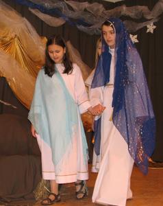 Wyjątkowość przedstawienia polegała również na wprowadzeniu dwóch postaci Maryi. Jedna do dojrzała Matka Zbawiciela, która opowiada dwunastoletniemu Jezusowi- Kamili Kwarciak, historię jego narodzenia. Rolę Matki objęła Justyna Russek. Józefa, dojrzałego opiekuna zagrał Michał Morek. Druga Maria to nastoletnia dziewczyna, u progu rozwiązania- narodzenia Boskiego Dzieciątka. W tą rolę wdzięcznie wcieliła się Natalia Janicka, która swym pięknym śpiewem głęboko poruszyła serca widzów. Piotr Bałys zagrał Józefa, szukającego schronienia dla Bożej Rodziny. Narodziny Dzieciątka obwieszczały zastępy anielskie – uczennice z klas IV-VI z Archaniołem Gabrielem (tu Martyną Skrzyńską) na czele. W roli pasterzy mogliśmy zobaczyć chłopców z klasy IV. W spektaklu nie zabrakło również Trzech Króli- chłopców z klasy VI. Nie sposób wymienić wszystkich aktorów, ale należy podkreślić zaangażowanie wszystkich, by przygotowany spektakl głęboko zapadł nam w pamięci.
