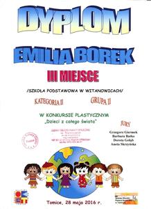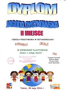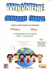 Ośrodek Kultury oraz Gminny Ośrodek Pomocy Społecznej w Tomicach zorganizowali konkurs plastyczny „Dzieci z całego świata.” W konkursie tym, podobnie jak i w innych konkursach, bardzo licznie uczestniczą uczniowie naszej szkoły. W dniu 24 maja 2016 r. komisja konkursowa wybrała prace, którym zostały przyznane miejsca oraz wyróżnienia. Na konkurs spłynęło ogółem 177 prac w następujących kategoriach: