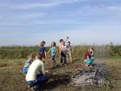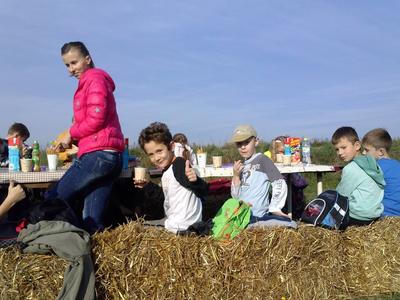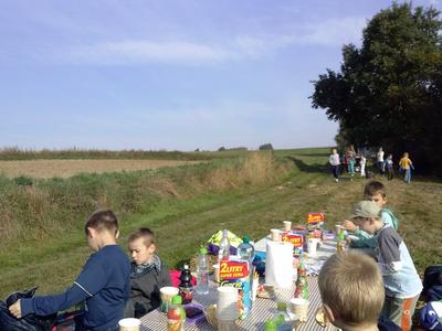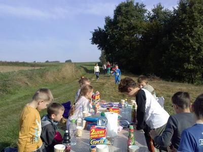 w piersiach. Wokół pola, lasy, jesienna szata i cudowne słońce... Na polance czekał na nas pięknie zastawiony stół z różnymi smakołykami. Kiedy już odpoczęliśmy, zjedliśmy tosty, ciasto i inne smakołyki, wspólnie przygotowaliśmy drewno na ognisko. Potem były zabawy, gry w piłkę, badmintona i biegi. Wesoło i szybko minął czas. Kiełbaski były pyszne. Wspaniały był również chleb z rusztu. Bardzo weseli