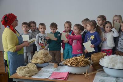 - pokaz naturalnej owczczej wełny, którą po odpowiedniej przeróbce używa się do robienia na drutach np. swetrów, czapek