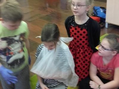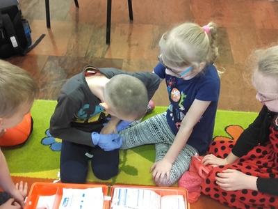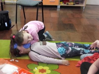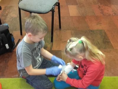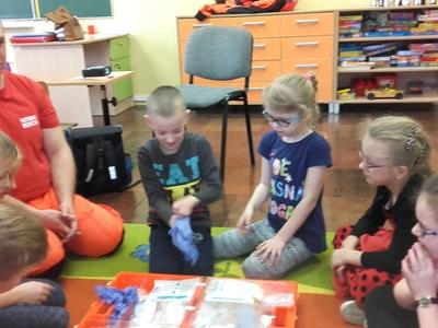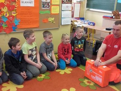 Pan Michał uświadomił uczniom na czym polega jego praca.Jak należy zachować się w nagłych wypadkach do momentu pojawienia się fachowej pomocy medycznej. Uczniowie wymienili ważne telefony alarmowe . Ratownik pokazał uczniom jak ułożyć rannego w pozycji bocznej ustalonej jako pozycji bezpiecznej dla osoby poszkodowanej. Dużym zainteresowaniem uczniów cieszyły się wskazówki związane z masażem serca i sztucznym oddychaniem. Pan Michał wyjaśnił, dlaczego te czynności są tak ważne w pierwszych minutach. Opowiedział uczniom, jak stwierdzić, czy osoba poszkodowana straciła przytomność. Po omówieniu zasad uczniowie bardzo chętnie i aktywnie wykonywali podstawowe czynności ratownicze pod fachowym okiem ratownika medycznego. Dziękujemy Panu Michałowi za poświęcony nam czas.