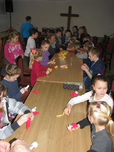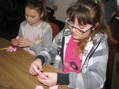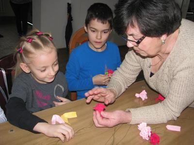 Oczywiście warsztaty nie skupiły się tylko na kwiatach. Panie nauczyły dzieci wykonywać zgrabnych koszyczków z użyciem włóczki. A to dopiero było zajęcie! Nie zabrakło również opowieści Pań z lat dzieciństwa, pysznych soczków, babeczek i ciasteczek, którymi Panie obdarowały uczestników spotkania.