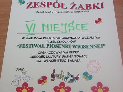 W dniu 28 marca odbył się "Festiwal Piosenki Wiosennej" organizowany przez Gminny Ośrodek Kultury w Tomicach. Nasze Przedszkole reprezentowała grupa 3-4-latków pod nazwą "Stokrotki", grupa 4-5-latków "Wiosenne nutki", grupa 5-6-latków "Żabki" oraz duet i solistka grupa Maluszków. Przedszkolaki biorący w nim udział śpiewająco, kolorowo i z humorem powitały wiosnę. Dzieci wykazały się talentem muzycznym i znajomością wiosennych utworów. Rywalizacja była duża, gdyż w festwalu brało udział około 200 przedszkolaków. Jury przyznało następujące miejsca: