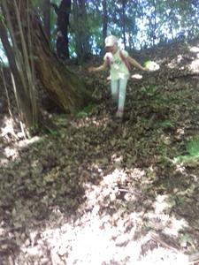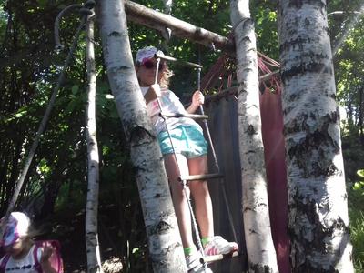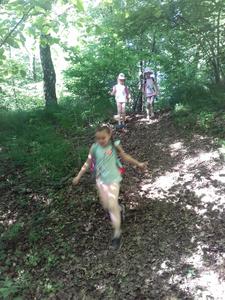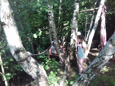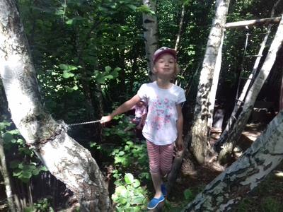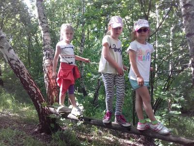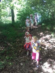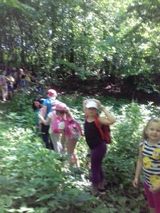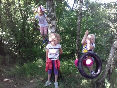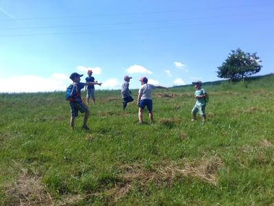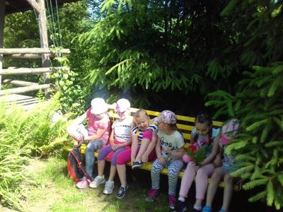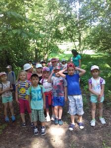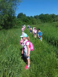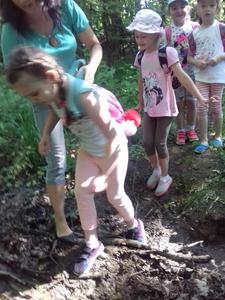 Z okazji Dnia Dziecka przedszkolaki z grupy 5-6-latków wybrały się do lasku zwanego „Stawiska”. Pogoda była piękna. Prowadziła nas mama Olka, która dobrze znała teren. Wędrówka odbywała się drogą, a gdzie nie było drogi to przez wysokie trawy. Jednak dzieciom to nie przeszkadzało - ręce w górę i można było maszerować dalej. Dzieci poznawały las poprzez obserwację, słuchając i wąchając. Wędrowaliśmy różnymi ścieżkami, przeskakując strumyki lub zbiegając po dość zboczach, ale nikogo to nie odstraszało, wręcz przeciwnie niektórzy specjalnie wychodzili na brzeg, żeby jeszcze raz zbiec na dół. Na koniec dotarliśmy do domu Olka, a właściwie na jego plac zabaw położony w niedużym lasku koło domu, gdzie dzieci mogły wspinać się po sznurowej drabince, przechodzić po kładce zawieszonej między drzewami, huśtać się na huśtawce, czy wreszcie grać w piłkę. Kiedy nadeszła pora powrotu do szkoły, dzieci z niechęcią opuściły plac zabaw. W drodze powrotnej pytały, kiedy znowu pójdziemy do lasu.