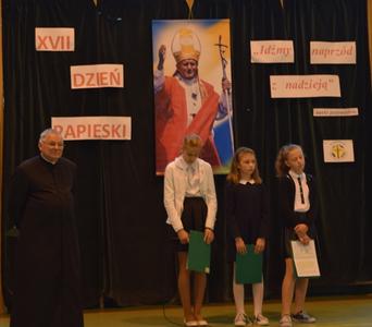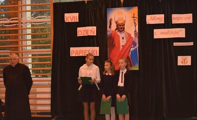W poniedziałek 9 października 2017 r. w naszej szkole odbył się krótki apel z okazji XVII Dnia Papieskiego. Uczniowie zaakcentowali ten dzień odświętnym galowym strojem. Spotkaniu przwodniczył ks. kan. Józef Wróbel. Nie zabrakło i tym razem modlitwy za wstawiennictwem św. Jana Pawła II oraz wspólnego śpiewu Barki.