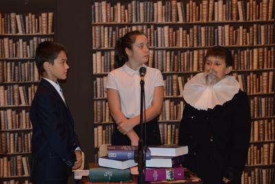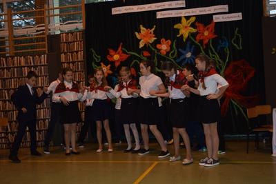 Następnie ze „szkolnej biblioteki ” w renesansowy świat Jana Kochanowskiego, patrona naszej szkoły, mogliśmy przenieść się za sprawą uczniów klasy piątej, którzy zaprosili nas na „Ucztę pod lipą”. Wsłuchiwaliśmy się w ponadczasowe utwory poety, a także mogliśmy usłyszeć muzyczne aranżacje fragmentów „ Pieśni świętojańskiej o Sobótce”. Całość dopełniała muzyka w wykonaniu Dawid Bydłonia, który na gitarze wygrywał renesansowe utwory muzyczne.