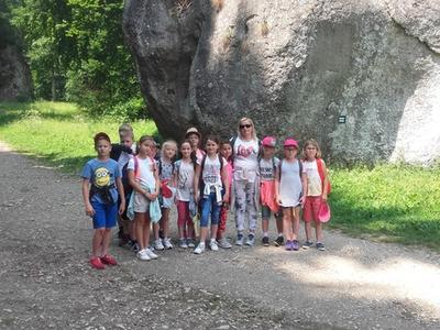 Dnia 11 czerwca 2018 roku klasy IIIa i IIIb udały się na wycieczkę do Ojcowa. Pierwszym punktem programu był spacer Doliną Prądnika do Bramy Krakowsko- Częstochowskiej. Dzieci dzielnie wędrowały pośród pięknej zieleni Ojcowskiego Parku Narodowego. Zwiedziliśmy też Grotę Łokietka. Temperatura wewnątrz wynosiła ok. 7 stopni. Poszczególne części jaskini miały nazwy pomieszczeń np. kuchnia, sypialnia. Następnie pojechaliśmy w kierunku Pieskowej Skały i Maczugi Herkulesa. Dużą uwagę uczniowie skupili podczas zwiedzania Zamku w Ogrodzieńcu, który był własnością króla Kazimierza Wielkiego. Jego mury zbudowane były ze skał. Niestety nadszedł i czas powrotu do domu. Wyprawa ta pokazała nam uroki polskiej przyrody i historii.