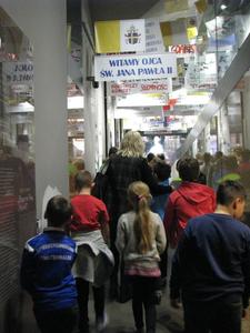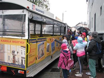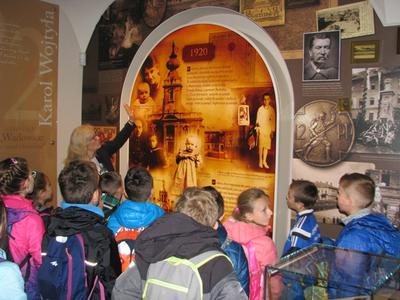 Już za kilka dni - 16 października 2018 roku - będziemy przeżywać 40-tą rocznicę wyboru kard. Karola Wojtyły na Stolicę Piotrową. Chcąc uczcić tę wyjątkową datę, uczniowie klasy II oraz III wraz z Wychowawcami i Katechetami odbyli pielgrzymko - wycieczkę do rodzinnych Wadowic Lolka. We wtorek 2 października rozpoczęli wyprawę Szlakiem Papieskim od nawiedzenia Bazyliki Mniejszej Ofiarowania N.M.P. w Wadowicach, by tu przy chrzcielnicy przypomnieć sobie Jego słowa: "Tu w tym mieście Wadowicach wszystko się zaczęło. I życie się zaczęło, i szkoła się zaczęła, i studia się zaczęły, i teatr się zaczął, i kapłaństwo się zaczęło..." Dziękując za dar sakramentu chrztu świętego odmówiliśmy modlitwę do Matki Bożej. Dalsze nasze kroki prowadziły w kierunku Ciuchci, którą przejażdżka z pewnością zakorzeni się w naszej pamięci. Chociaż pogoda była deszczowa, to jednak atmosfera w "pociągu" była gorąca. Podgrzewała ją słyszana historia o miejscach, które były cenne w życiu dorastającego Papieża. Uwieńczeniem naszej wyprawy byo zwiedzanie domu rodzinnego Karola Wojtyły, a więc Muzeum Domu Rodzinnego Św. Jana Pawła II. Wywarło ono na dzieciach ogromne wrażenie. Dzieci chciały wszystkiego dotknąć, wszystkiego posłuchać, niejako doświadczyć namacalnie tego, co było udziałem ich rówieśnika Lolka. Wiele głębokich przeżyć. Kolory sal, nowoczesna technika, dzięki której mogliśmy się przenieść w rok 1920 i późniejsze lata. Dla dzieci to odległa historia. Jednak ostatnia sala - sala biała- wypełniona ręcznie zapisanymi na katkach intencjami modlitw tysięcy ludzi składanych na grobie Św. Jana Pwła II - to świadectwo żywej i prawdziwej wiary i modlitwy - wzbudziło w dzieciach największy zachwyt. Modlitwy w różnych językach świata, a wśród nich i język polski...