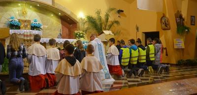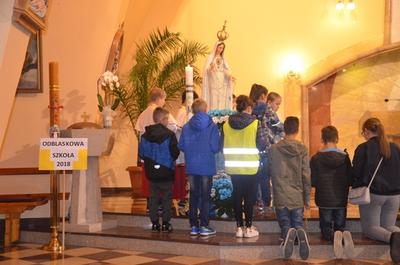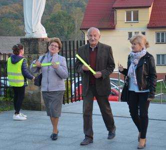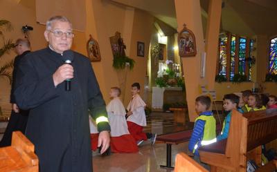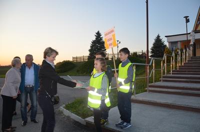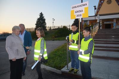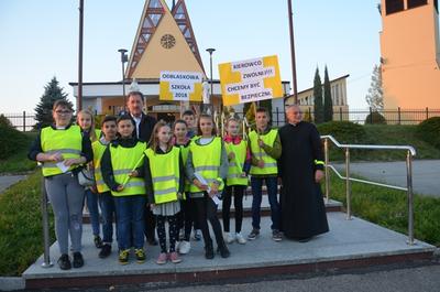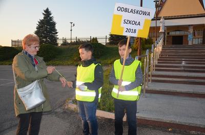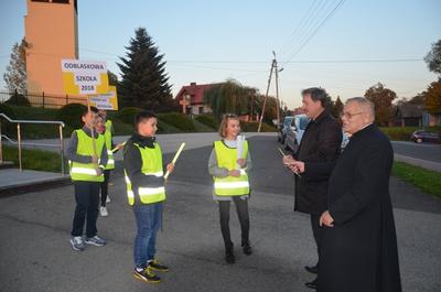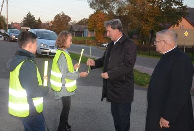Odblaskowa Szkoła jest realizacją różnorodnych działań nie tylko na terenie szkoły i terenu z nim sąsiadującego, ale ma zakres o wiele szerszy. Tym razem uczniowie naszej szkoły wraz z opiekunami udali się późnym popołudniem10 października na teren kościoła parafialnego w Witanowicach. Wiemy, że w miesiącu październiku codziennie porą wieczorną odbywają się w kościele Nabożeństwa Różańcowe. Przybywają na nie ludzie z odległych miejsc, niejednokrotnie przemierzając długie odległości idąc pieszo. Chcąc zachęcić wszystkich do noszenia odblasków, by byli bardziej widoczni na drodze, postanowiliśmy rozdawać opaski odblaskowe zwłaszcza ludziom starszym i tym, którzy nie mają swych pociech w szkole. Pragniemy, by i oni je nosili na rękach. Oczywiście przy okazji przypominaliśmy o bezpieczeństwie zwłaszcza podczas przechodzenia przez skrzyżowanie przy kościele. Miłą dla nas niespodzianką było spotkanie z senatorem panem Andrzejem Pająkiem, który w środowe popołudnie zaszczycił Parafię swą obecnością. Pochwalił naszą akcję i życzył, byśmy nie ustali w podjętych wysiłkach. Przed Mszą Św. proboszcz Ks. Józef Wróbel zaapelował do ludzi, by dbając o swe bezpieczeństwo zawsze zakładali na rękę opaski odblaskowe. Tych, którzy wędrują poboczem, a nie chodnikiem zachęcił też do zakładania kamizelek odblaskowych. Do wszystkich kierowców zwrócił się z apelem, by przejeżdżając w pobliżu kościoła zwalniali, gdyż ruch w porach nabożeństw jest tu bardzo duży.