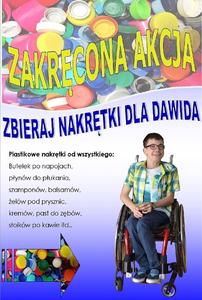 Serdecznie zapraszamy do włączenia się w przeprowadzaną już kolejny raz akcję charytatywną "Zbieraj z nami nakrętki". Pragniemy pomóc uzyskać sprzęt rehabilitacyjny Dawidowi i Alanowi. Nakrętki przynosimy do szkoły i wrzucamy do pojemnika na dolnym korytarzu. Akcja trwa do końca roku szkolnego. Odpowiedzialnymi za sprawne przeprowadzenie zbiórki nakrętek są wolontariusze - koledzy z kl. VII i VIII.