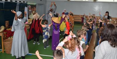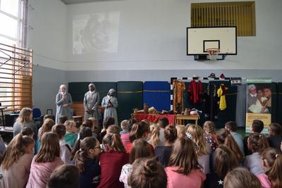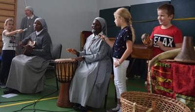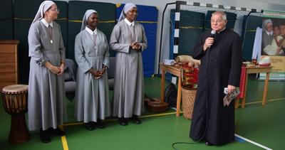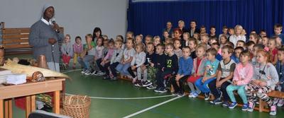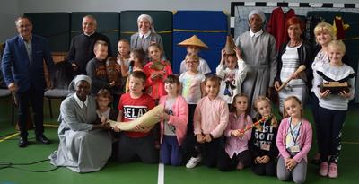 W poniedziałek 23 września uczniowie klas 0 - VIII uczestniczyli w warsztatach wolontariatu misyjnego. Prowadziły je Siostry Misjonarki - Klawerianki z Krakowa: S. Kazimiera i dwie Siostry z Nigerii: S. Antonia i S. Sancja. Przybliżyły nam kulturę i życie mieszkańców Nigerii. Uczniowie mogli bezpośrednio zetknąć się z jednym z języków Nigerii - chociażby poprzez naukę krótkiej piosenki. Siostry przywiozły ze sobą wiele ciekawych eksponatów, które były w większości wykonane przez ludność z Nigerii. Ciekawą nauką była próba noszenia pojemników na wodę na głowie, co jak okazało się jest umiejętnością bardzo trudną. Barwność strojów tradycyjnych z różnych kontynentów również wzbudziła u dzieci zainteresowanie. Na koniec warsztatów można było zadać nurtujące nas pytania, pooglądać eksponaty, a także zatańczyć z Siostrami tradycyjny taniec. Każde dziecko mogło zabrać ze sobą pamiątkową gazetkę misyjną i okolicznościowy obrazek. Siostra Kazimiera, w imieniu Sióśtr Misjonarek podziękowała serdecznie za wspólne spotkanie, ale także za wszystkie dzieła, które wolontariat misyjny podejmował w ubiegłym roku we współpracy z Nauczycielami i Rodzicami. Szczególnie podziękowała za dar Kolędników Misyjnych, który został przekazany na potrzeby dzieci w Peru. Podpowiedziała nam także różne inne formy działalności szkolnego wolontariatu, które z pewnością będziemy się starać wypełnić w obecnym roku szkolnym.