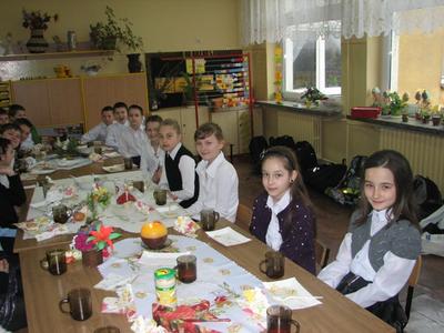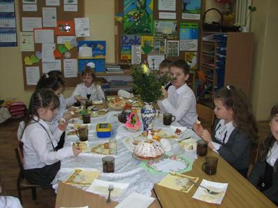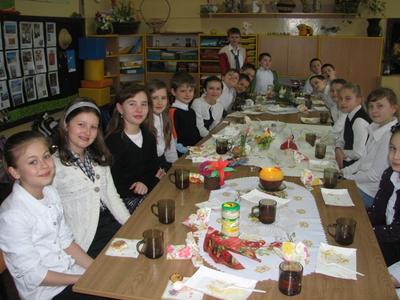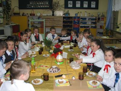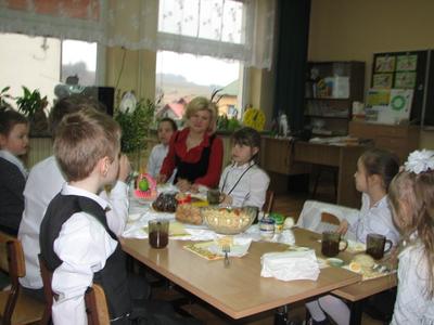 Przy świątecznym stole spotykamy się jak co roku. Jest to już tradycja pielęgnowana w naszej szkole od dawna. Uczniowie wraz z wychowawcami organizują w klasach wielkanocne stoły. Są one zastawione świątecznymi potrawami i ozdobami. Na białym światecznym obrusie są m.in. jajka - symbol nowego życia, sól, chrzan, baby wielkanocne oraz ozdoby - bukszpan jako symbol gałązki oliwnej, baranek - symbol Zmartwychwsałego Chrystusa. W prawdziwie rodzinnej atmosferze wszyscy składają sobie nawzajem życzenia, a następnie spożywają przygotowane potrawy.