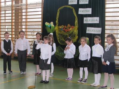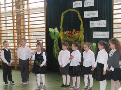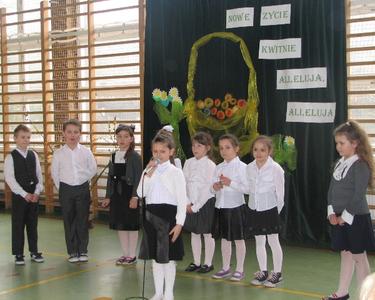 30 marca w naszej szkole odbył się apel poświęcony zbliżającym się Świętom Wielkanocnym. Montaż słowno - muzyczny pt. Welkanocne tradycje przygotowała i przedstawiła najmłodsza klasa - czyli klasa I, pod kierunkiem wychowawczyni p. Doroty Klaja. Uczniowie zaprezentowali teksty poetyckie, jak rownież fragmenty prozy. Przedstawili zwyczaje, obrzędy, symbolikę wiązaną z tradycjami Świąt Wielkej Nocy. Pieknie recytowali wiersze, a oprawa muzyczna oraz znane utwory Arki Noego - Na Drugi Brzeg, Chrystus Zmartwychwstał wprowadziły w świąteczny nastrój. Po apelu głos zabrał pan dyrektor, który złożył wszystkim uczniom, pracownikom i zgromadzonym rodzicom świąteczne życzenia. Na zakończenie podsumowano konkursy.