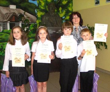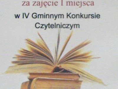 W dniu 25 maja 2012 roku w Gminnym Ośrodku Kultury odbył się już po raz czwarty konkurs czytelniczy dla uczniów klas III - IV szkół podstawowych. Naszą szkołę reprezentowali przygotowywani przez panią mgr Annę Bussler następujący uczniowie: Antoni Kokoszka, Damian Ryba, Kamila Szczerbik i Sabina Żurek. Po sześciu konkurencjach okazało się, że nasza drużyna jest na medal. Pokonała różnicą aż 12 punktów drużynę zajmującą drugie miejsce. W nagrodę uczniowie otrzymali pamiątkowe dyplomy oraz nagrody rzeczowe, którymi były książki oraz słodycze. Dla szkoły wywalczyli bon o wartości 300 zł na zakup książek do biblioteki.
