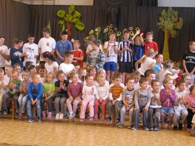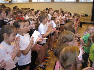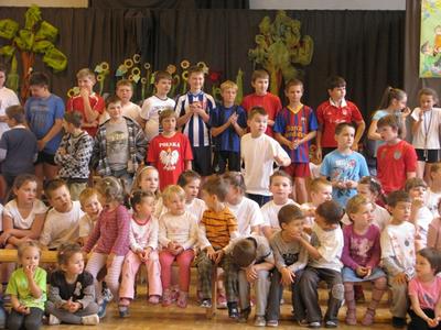 W piątek 1 czerwca 2012 roku zgromadziliśmy się na sali gimnastycznej o godz. 9.00, aby wspólnie świętować Międzynarodowy Dzień Dziecka. Począwszy od tych najmłodszych z oddziałów przedszkolnych, aż po szóstaków świetnie bawiliśmy się przez godzinę. Jednak było to spotkanie nieco inne. Na początku Pan Dyrektor złożył wszystkim najlepsze życzenia - tym mniejszym i tym większym Dzieciom. Następnie koleżanki z kl. VI przedstawiły scenkę prezentowaną na gminnym konkursie o Unii Europejskiej. Dalsza część świętowania przybrała formę już sportową. Rozpoczęliśmy ją od odśpiewania polskiego hymnu "Euro 2012". I wreszcie najbardziej oczekiwany moment - rozgrywki sportowe. Pierwszą niespodzianką - było zobaczyć naszych nauczycieli w strojach sportowych, a drugą - wspólne rywalizacje sportowe "Dzieci kontra Nauczyciele". Oj, było dużo radości i emocji. A konkurencje były następujące: