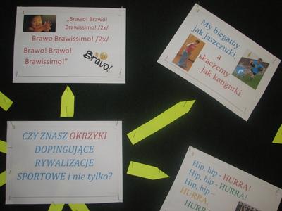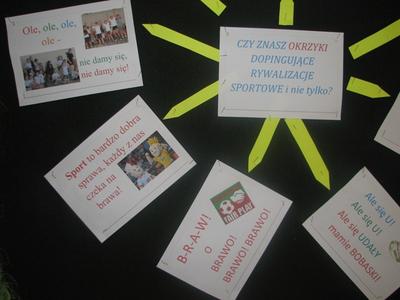 Szczególnym akcentem wtorkowego dnia była nauka okrzyków dopingujących zawodników oraz nagradzających ich za sportowe rozgrywki. Okazało się, że dopingujący kibice też potrafią się świetnie bawić. Na szkolnej gazetce zostały utrwalone poznane okrzyki, dzięki czemu łatwiej nam będzie je zapamiętać, by do nich wracać.