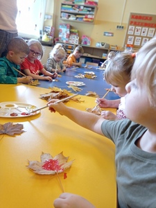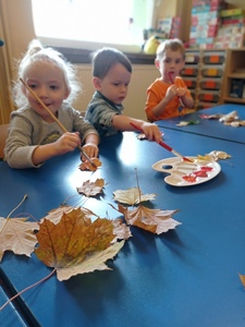 - malowały zebrane liście (podczas spaceru) farbą plakatową i odbijały na białej kartce.