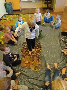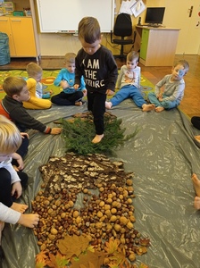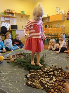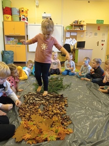 - spacerowały po leśnej ścieżce sensorycznej utworzonej z przyniesionych darów jesieni, był to pewnego rodzaju tor przeszkód, którego funkcją jest stymulowanie zmysłu dotyku.