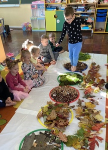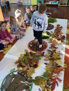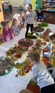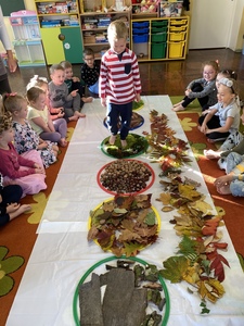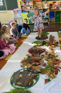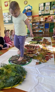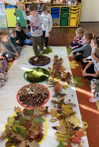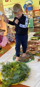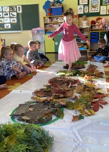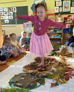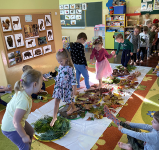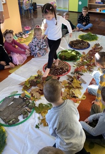 Las w naszej sali był dla nas zupełną niespodzianką. Najpierw go zobaczyliśmy i zachwyciliśmy się jego różnorodnością, następnie poczuliśmy przyjemny, leśny zapach, by na koniec przespacerować się i poczuć to wszystko pod naszymi stopami.