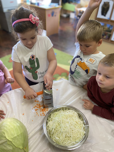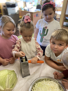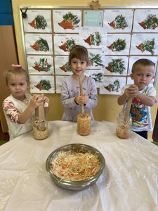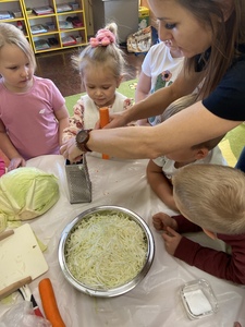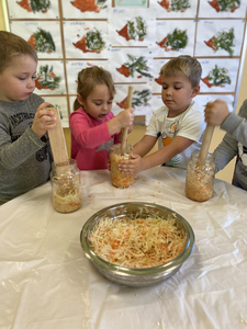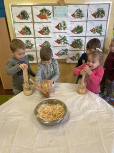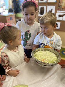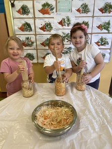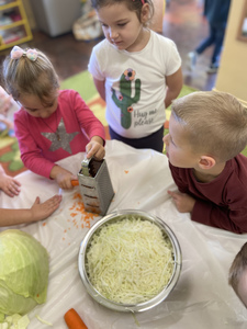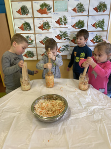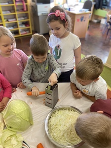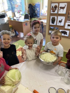 Dnia 27 października grupa Lisków poszerzyła swój zakres wiedzy o „Kiszonej kapuście”. Zaczęło się niewinnie bo od nauki piosenki. Przez co grupa „Lisków” wzbogaciła przeżycia muzyczne, rozwinęła poczucie rytmu. Dowiedziała się jakie korzyści niesie jedzenie „kiszonej kapusty” i jakie są zawarte w niej witaminy. Następnie przedszkolaki zapoznały się z procesem kiszenia kapusty. Po czym rozpoczęliśmy wspólną i ciężką pracę.
