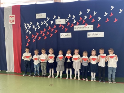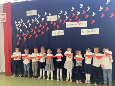 W dniu 10 listopada 2021 r. w naszym przedszkolu obchodziliśmy Narodowe Święto Niepodległości (11 listopada). Z tej okazji wspólnie odśpiewaliśmy hymn narodowy. Głównym celem w tym dniu było kształtowanie miłości i przywiązania do kraju ojczystego, jego kultury i tradycji oraz poznanie symboli narodowych naszego kraju. Dzieci tego dnia do przedszkola przyszły ubrane na galowo. Słowem i piosenką oddały szacunek symbolom narodowym. Po zakończeniu części artystycznej przedszkolaki wraz z wychowawczyniami obejrzały film Instytutu Pamięci Narodowej „Polak Mały”, który przybliżył dzieciom znaczenie symboli narodowych. Dzień Niepodległości stał się bardzo radosnym dniem w naszym przedszkolu i mamy nadzieję, że zapadnie on w pamięci naszych „Małych Polaków” .Pozwoli też na przekazanie tej cząstki zdobytej historii innym dzieciom. Dzięki udziałowi w tego typu uroczystościach nasze maluchy uczą się patriotyzmu, kształtują pozytywne postawy i uczucia patriotyczne.