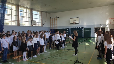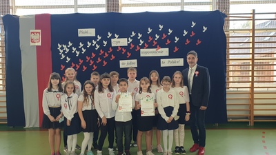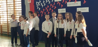 Uczniowie klasy VI podczas swojego występu uczcili odzyskanie przez Polskę niepodległości. Podczas tej krótkiej „lekcji historii” przypomnieli o smutnym czasie niewoli naszej Ojczyzny i drodze, jaką musieli pokonać polscy Patrioci, by przywrócić Jej wolność. Poprzez wiersze i piosenki nasza młodzież pokazała swoją pamięć i przywiązanie do Polski. Jak co roku, wspólnie odśpiewaliśmy cztery zwrotki Hymnu Państwowego.