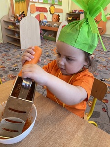 Celem tego dnia było przedstawienie i promowanie spożywania warzyw i owoców jako darów natury na przykładzie marchewki, rozwijanie umiejętności współdziałania w zespole. Wszystkie nasze działania w tym dniu były związane tematycznie z marchewką. Najpierw dzieci odszukiwały marchewki ukryte w sali, były zabawy ruchowe ze śpiewem-urodziny marchewki, zabawa zręcznościowa - zajączki na polu marchewkowym zabawa orientacyjno-porządkowa z podawaniem marchewki z rąk do rąk, dzieci układały marchewkowy płotek (marchewki od najmniejszej do największej), zagadki i tańce integracyjne przy muzyce.