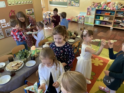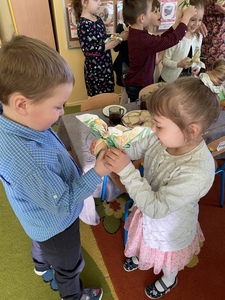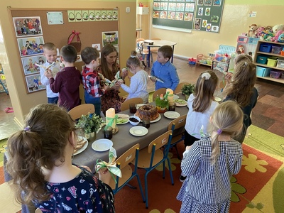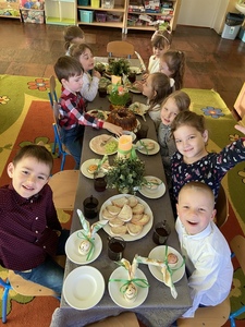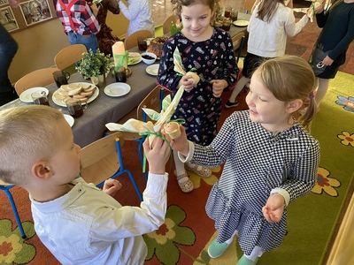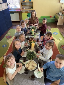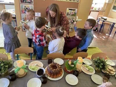 z bukszpanu, rzeżuchy oznaczających przyrodę, która budzi się do życia. Wspólne, uroczyste śniadanie wywołało miłe i niezapomniane doznania, które na długo pozostaną w pamięci wszystkich przedszkolaków.