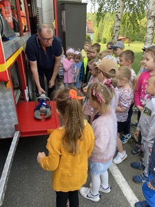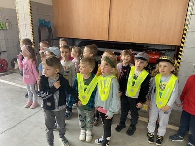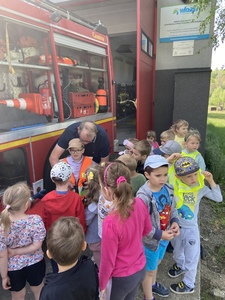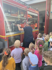 Wycieczka wzbudziła ogromne zainteresowanie dzieci. Przed remizą strażacką czekał na przedszkolaków pan Zbigniew Kwarciak. W trakcie spotkania pan strażak zaprezentował dzieciom sprzęt pożarniczy stanowiący wyposażenie jednostki Straży Pożarnej. Przedszkolaki z wielkim zainteresowaniem wysłuchały opowieści o trudnej, odpowiedzialnej i niebezpiecznej pracy strażaka, utrwaliły telefonu do Straży Pożarnej - 998 i numer alarmowy – 112. Dużo radości sprawiło dzieciom przymierzanie hełmu i odzieży ochronnej używanej w akcjach ratowniczo. Ponadto oglądały wozy strażackie, poznały wyposażenie