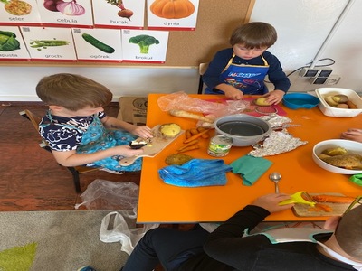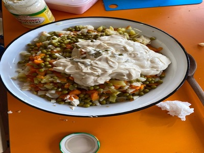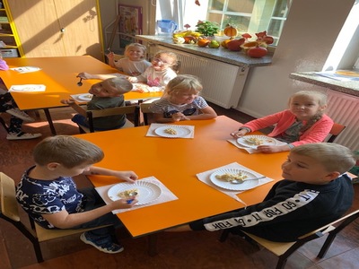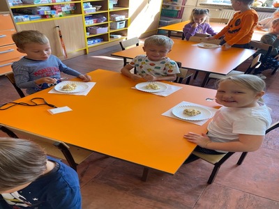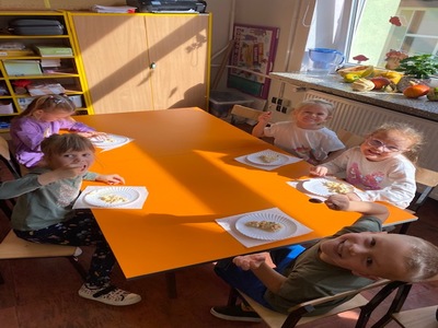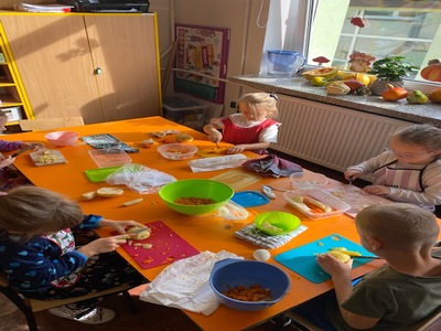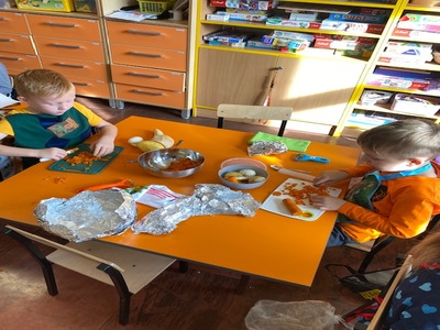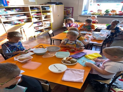 Na dzisiejszych zajęciach kulinarnych dzieci wykonały sałatkę jarzynową. Wspólnie z nauczycielem czytały tekst wyrazowo – obrazkowy – przepis na sałatkę jarzynową. Następnie umyły ręce, założyły fartuszki i zabrały się do pracy. Pierwszym etapem było obranie ugotowanych wcześniej warzyw - dzieci ostrożnie posługiwały się obieraczką i nożem. Potem doskonale pokroiły wszystkie składniki, przesypały je do dużej miski i wymieszały. Dodały majonez, doprawiły solę i pieprzem. Najbardziej oczekiwanym momentem była degustacja własnoręcznie wykonanej sałatki. Było pysznie i zdrowo!