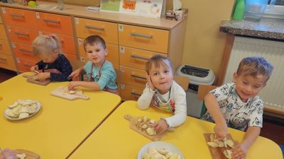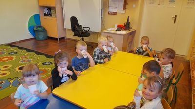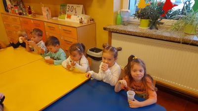 W piątek 30 września było w naszym przedszkolu przesmacznie, a przede wszystkim zdrowo! Dzieci z grupy „Tygryski” na zajęciach przygotowały pyszny, witaminowy koktajl owocowy. Dzieci przyniosły z domów różne świeże owoce. Były jabłka, gruszki, banany, śliwki. Wszyscy mieli soczyste minki na widok tak smakowitych owoców i każdy ochoczo zabrał się do pracy. Dokładnie umyliśmy rączki, potem ubraliśmy fartuszki, a następnie posegregowaliśmy umyte wcześniej owoce. Każdy dostał talerzyk, nożyk i tak przystąpiliśmy do krojenia. Dzieci samodzielnie kroiły owoce, przestrzegając zasad bezpieczeństwa przy posługiwaniu się nożem. Następnie zmiksowaliśmy w blenderze, pokrojone wcześniej owoce. Przyrządzanie koktajlu dało dzieciom wiele satysfakcji jednocześnie uświadamiając jak ważną rolę odgrywają witaminy we właściwym funkcjonowaniu organizmu. Koktajl smakował wszystkim przedszkolakom.